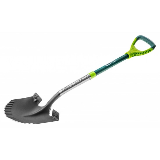 VERTO Hegyes ásó. Főként kerti és építési talajmunkákhoz. A fej kimagasló minőségű edzett acélból készül, hegyes, speciálisan fogazott éllel, mely megkönnyíti az ásást a gyökeres vagy kavicsos talajban. A speciálisan recézett, üvegszál nyél növeli a biztos fogást. A műanyagból készült dupla anyagú markolat kiválóan belesimul a kézbe, megkönnyítve a munkavégzést a szerszámmal. Fém erősítés a sérüléseknek leginkább kitett helyeken (a nyél és a fej kapcsolódásánál). Széles, profilozott támasz a lábaknak, ami növeli a munka komfortját.