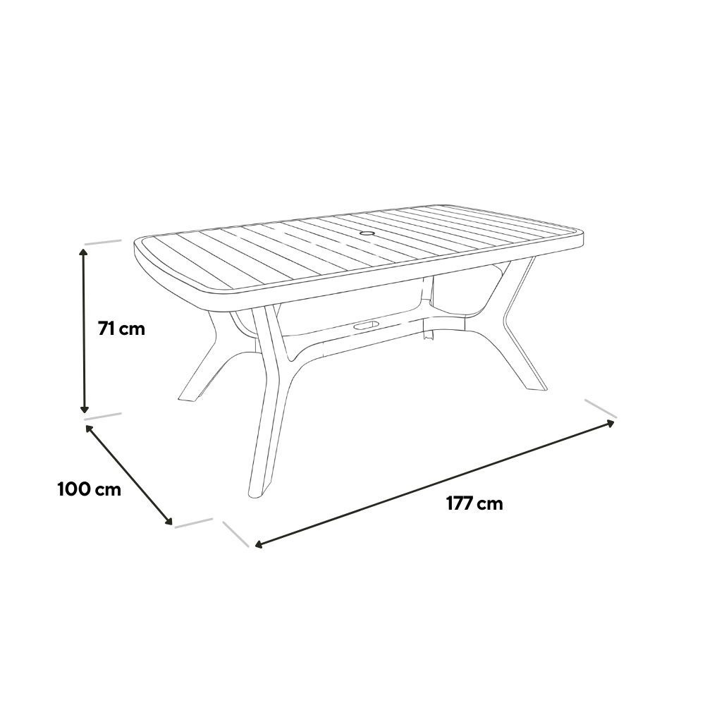 Remekül ellenáll a mindennapos igénybevétel során keletkező erőhatásoknak és az időjárási elemeknek, napfénynek, esőnek, UV-sugárzásnak egyaránt. Hosszú éveken keresztül meg tudja őrizni az eredeti szépségét. A széles, ovális formájú asztalfelület körül kényelmesen elfér 6 személy.