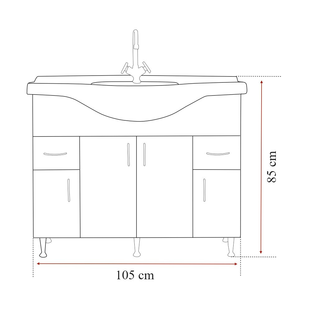 A fürdőszobabútor kevés helyet foglal viszont tágas alsó szekrénnyel és tükörrel (világítás nem része a terméknek) rendelkezik ahol kényelmesen elférnek a fürdőszobai pipere eszközök. Kevés helyigénye miatt kisebb fürdőszobák berendezésére is alkalmas, például panel lakásokban. A termék magas minőségű bútorlapból készül és színben passzoló élzárókkal van ellátva. A fürdőszoba bútor mosdóval együtt kapható.