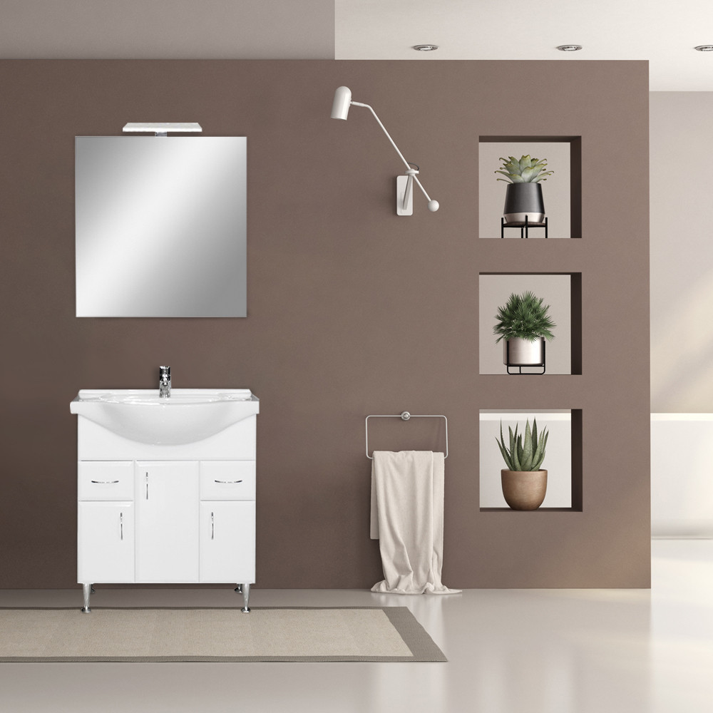 A fürdőszobabútor kevés helyet foglal viszont tágas alsó szekrénnyel és tükörrel (világítás nem tartozék) rendelkezik ahol kényelmesen elférnek a fürdőszobai pipere eszközök. Kevés helyigénye miatt kisebb fürdőszobák berendezésére is alkalmas, például panel lakásokban. A termék magas minőségű bútorlapból készül és színben passzoló élzárókkal van ellátva. A fürdőszoba bútor mosdóval együtt kapható.