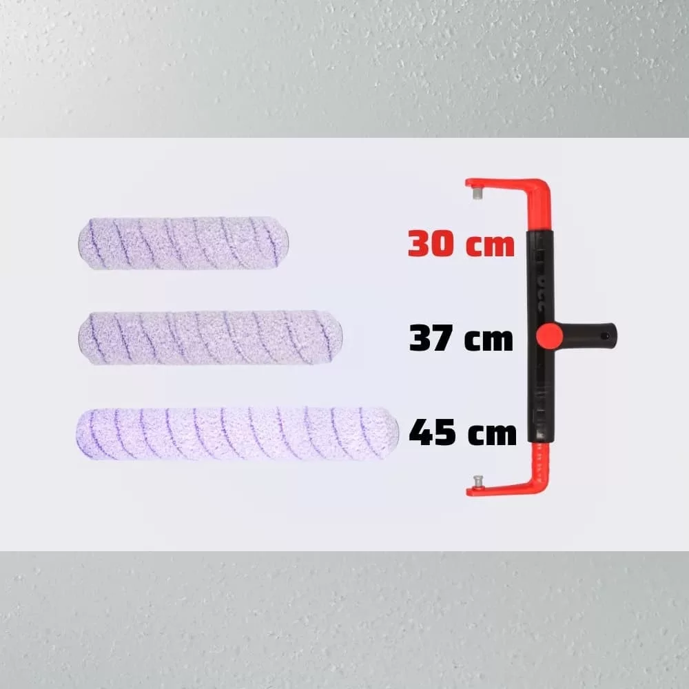 Az állítható szélesség (28–46 cm) lehetővé teszi különböző méretű festőhengerek használatát, így rugalmasan alkalmazkodik a feladathoz. A Y-alakú kialakítás egyenletes nyomáselosztást biztosít, ami segít elkerülni a csíkozást és javítja a festék egyenletes felvitelét.