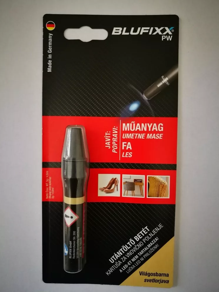 BLUFIXX-Fényre megkeményedő javító gél patron műanyag és fa anyagokra.