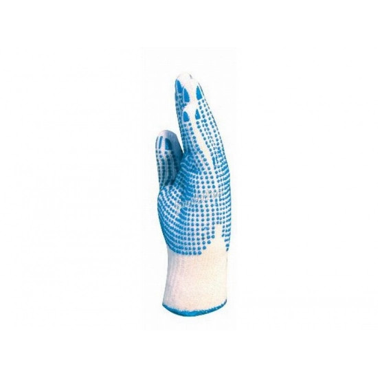 KÖTÖTT PES/PAMUT FEHÉR KESZTYŰ, KÉT OLDALON KÉK PETTYEK_9 MINDKÉT OLDALON PETTYEZETT, NÉGY SZÁLAS KESZTYŰ: • kötött, négy szálas poliészter/pamut cérna • csúszás elleni pöttyök mind a két oldalon • két oldalon használható, hosszabb élettartam • gumírozott mandzsetta • 4355: kék pöttyös, férfi • SÚLY: 78 g • MÉRET: 9-es • CSOMAGOLÁS: 240/12 • EU szabvány: EN420, 1. kat