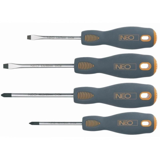 A NEO csavarhúzó szett 4 csavarhúzóból áll: lapos és kereszt csavarhúzókból. A csavarhúzó szára kivételesen ellenálló króm-vanád