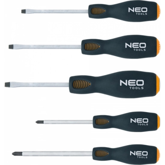 A NEO üthető csavarhúzó szett 5 csavarhúzóból áll: lapos és kereszt csavarhúzókból. A csavarhúzó hegye kivételesen ellenálló S2. A csavarhúzó hegy hőkezelésnek lett alávetve, így megfelelő, 56 HRC keménységet és hajlítószilárdságot ért el. A csavarhúzó hegye mágneses, markolata üthető. A markolat három élű hasáb alakja a kialakított hüvelyktámasszal csökkenti a kéz megterhelését munka közben, és megkönnyíti a megfelelő forgatónyomaték elérését. A bimateriál markolat nem csúszik ki a kézből, ellenálló vegyszerek, kenőolajok és zsírok hatásának. A szerszám minőségét bizonyítja a TÜV tanúsítvány és a gyártó által nyújtott 25 éves jótállás. A NEO márka a professzionális igényeket is kielégíti.