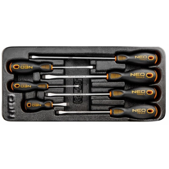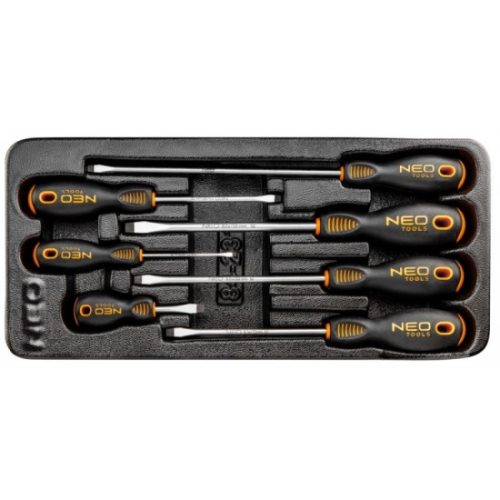 NEO lapos csavarhúzók a csavarhúzók csúcsa kivételesen erős S2 acél ötvözetből készülnek. A csúcsok munkafeje hőmegmunkálva, melynek köszönhetően keménysége és hajlítószilárdsága 56 HRC. A csavarhúzók mágneses, szilárdított fejjel rendelkeznek. A profilozott hüvelykujj támasztós, háromszöges kialakítású markolat csökkenti a kéze megterhelését a munka közben és megkönnyíti az optimális nyomaték elérését. A kétanyagú markolat megakadályozza a kicsúszást és ellenáll a vegyszerek, olajok és zsírok hatásának. A szerszámok praktikus, a NEO 84-221 és 84-222 szerszámos szekrények fiókjaiba illő műanyag bőröndben leszállítva. A szerszám minőségét a TÜV tanúsítvány és a gyártó 25 éves garancia igazolja. A NEO márka a professzionális igényeket is kielégíti.