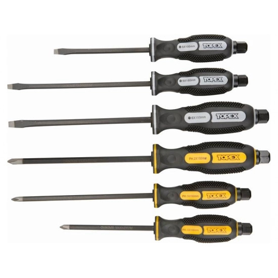 A TOPEX üthető csavarhúzó készlet ragasztott, erősen meghúzott csavarok be- és kicsavarására szolgál. Mindegyikük szára nagy ellenállóképességű, a szerszámnak hosszú élettartamot biztosító króm-vanádium acélból készült. A mágneses hegy megkönnyíti a szerszámmal végzett munkát A műanyagból készült ergonómikus markolat jól fekszik a tenyérben, növelve a munkavégzés kényelmét. Praktikus, a tárolást megkönnyítő műanyag akasztón vannak elrendezve. A TOPEX márka ezermestereknek készül.