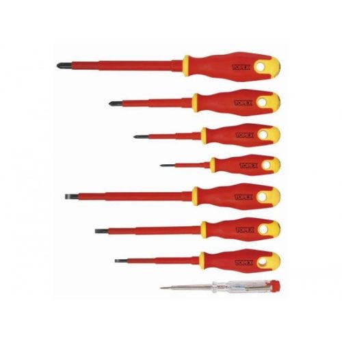 A TOPEX 1000 V csavarhúzókészlet a legfeljebb 1000 V feszültség alatti munkákra szolgál. A hét csavarhúzó mindegyike kiváló minő