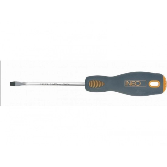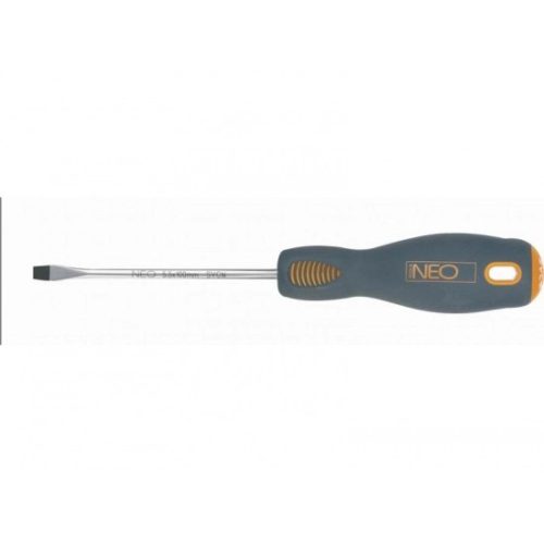 NEO lapos csavarhúzó. A csavarhúzó szára kivételesen ellenálló S2. A csavarhúzó hegy hőkezelésnek lett alávetve, így megfelelő, 56 HRC keménységet és hajlítószilárdságot ért el. A csavarhúzó hegye mágneses. A markolat három élű hasáb alakja a kialakított hüvelyktámasszal csökkenti a kéz megterhelését munka közben, és megkönnyíti a megfelelő forgatónyomaték elérését. A bimateriál markolat nem csúszik ki a kézből, ellenálló vegyszerek, kenőolajok és zsírok hatásának. A szerszám minőségét bizonyítja a TÜV tanúsítvány és a gyártó által nyújtott 25 éves jótállás. A NEO márka a professzionális igényeket is kielégíti.