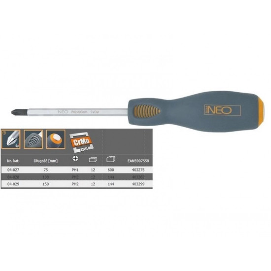 NEO üthető kereszt csavarhúzó. A csavarhúzó különlegesen megerősített hegye kivételesen ellenálló króm-vanádium acélból készül. A csavarhúzó hegy hőkezelésnek lett alávetve, így megfelelő, 56 HRC keménységet és hajlítószilárdságot ért el. A csavarhúzó hegye mágneses, markolata üthető. A markolat három élű hasáb alakja a kialakított hüvelyktámasszal csökkenti a kéz megterhelését munka közben, és megkönnyíti a megfelelő forgatónyomaték elérését. A bimateriál markolat nem csúszik ki a kézből, ellenálló vegyszerek, kenőolajok és zsírok hatásának. A szerszám minőségét bizonyítja a TÜV tanúsítvány és a gyártó által nyújtott 25 éves jótállás. A NEO márka a professzionális igényeket is kielégíti.