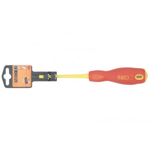 NEO 1000 V lapos csavarhúzó. A szerszám max. 1000 V feszültség alatti használatra minősített. A csavarhúzó szára kivételesen ellenálló króm-vanádium acélból készül. A csavarhúzó hegy hőkezelésnek lett alávetve, így megfelelő, 56 HRC keménységet és hajlítószilárdságot ért el. A csavarhúzó hegye mágneses. A markolat három élű hasáb alakja a kialakított hüvelyktámasszal csökkenti a kéz megterhelését munka közben, és megkönnyíti a megfelelő forgatónyomaték elérését. A bimateriál markolat nem csúszik ki a kézből, ellenálló vegyszerek, kenőolajok és zsírok hatásának. A szerszám minőségét bizonyítja a TÜV tanúsítvány és a gyártó által nyújtott 25 éves jótállás. A NEO márka a professzionális igényeket is kielégíti.