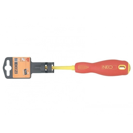 NEO 1000 V kereszt csavarhúzó. A szerszám max. 1000 V feszültség alatti használatra minősített. A csavarhúzó szára kivételesen ellenálló króm-vanádium acélból készül. A csavarhúzó hegy hőkezelésnek lett alávetve, így megfelelő, 56 HRC keménységet és hajlítószilárdságot ért el. A csavarhúzó hegye mágneses. A markolat három élű hasáb alakja a kialakított hüvelyktámasszal csökkenti a kéz megterhelését munka közben, és megkönnyíti a megfelelő forgatónyomaték elérését. A bimateriál markolat nem csúszik ki a kézből, ellenálló vegyszerek, kenőolajok és zsírok hatásának. A szerszám minőségét bizonyítja a TÜV tanúsítvány és a gyártó által nyújtott 25 éves jótállás. A NEO márka a professzionális igényeket is kielégíti.