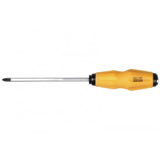 A TOPEX üthető kereszt csavarhúzó besült, túl erősen meghúzott csavarok kilazítására, meghúzására szolgál. Szára 75 mm hosszú, és nagy ellenállóképességű, a szerszámnak hosszú élettartamot biztosító króm-vanádium acélból készült. A PH1-es, mágneses, edzett acél hegy megkönnyíti a szerszámmal végzett munkát A műanyagból készült ergonómikus markolat jól fekszik a tenyérben, növelve a munkavégzés kényelmét. A TOPEX márka ezermestereknek készül.