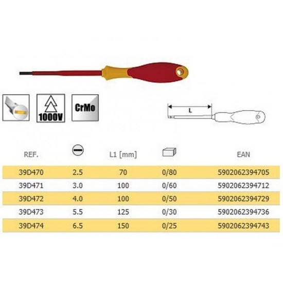 A TOPEX lapos csavarhúzó 1000 V a legfeljebb 1000 V feszültség melletti munkákra szolgál. Kiváló minőségű króm-molibdén acélból