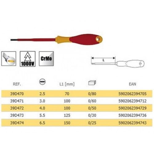 A TOPEX lapos csavarhúzó 1000 V a legfeljebb 1000 V feszültség melletti munkákra szolgál. Kiváló minőségű króm-molibdén acélból