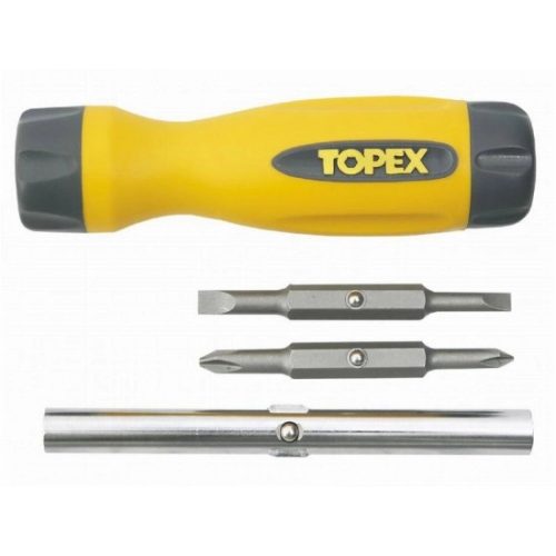 A TOPEX kétoldalas csavarhúzó kiváló minőségű, a szerszámnak hosszú élettartamot biztosító króm-vanádium acélból készül. Az ergo