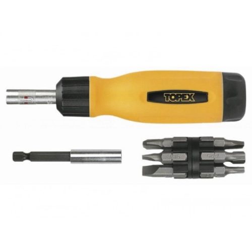 TOPEX ?”-os csavarhúzó bitek. Kiváló minőségű, a szerszámnak hosszú élettartamot biztosító króm-vanádium acélból készültek. Az ergonómikus műanyag markolat kiváló használati kényelmet biztosít. A bitek praktikus tartóban kaptak helyet, ami helytakarékos megoldás és a keresgélés időszükségletét is lerövidíti. A TOPEX márka ezermestereknek készül.