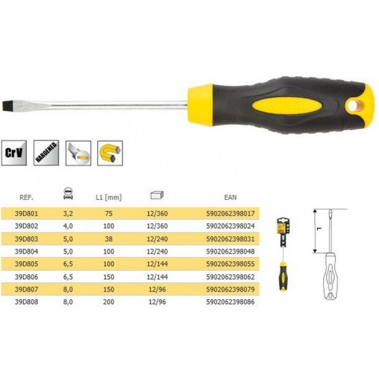 A TOPEX lapos csavarhúzó kiválóan beválik szerelési, barkácsolási munkákban. Hegye nagy ellenállóképességű, a szerszámnak hosszú élettartamot biztosító króm-vanádium acélból készült. A mágneses hegy megkönnyíti a szerszámmal végzett munkát Az ergonómikus, csúszásmentes anyaggal bevont műanyag markolat biztosítja a kényelmet és a biztonságot a munkavégzés során. A TOPEX márka ezermestereknek készül.