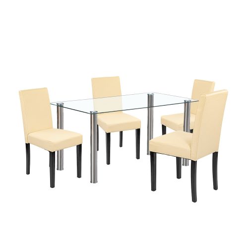 A szett négy darab Leziter Kelly széket is tartalmaz, amelyek bézs ECO bőr kárpitozással készültek. Az elegáns megjelenés mellett ezek a székek rendkívül könnyen tisztíthatók. A 4 cm vastag habszivacs ülőfelület hosszabb étkezések során is komfortot nyújt, a stabil fenyőfa lábak pedig 120 kg teherbírással garantálják a hosszú távú megbízhatóságot.