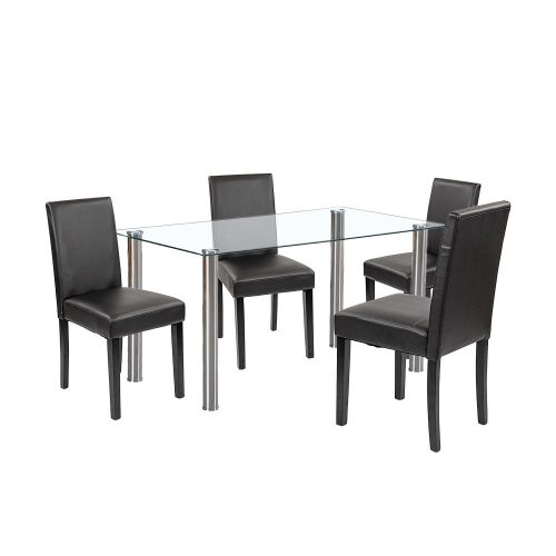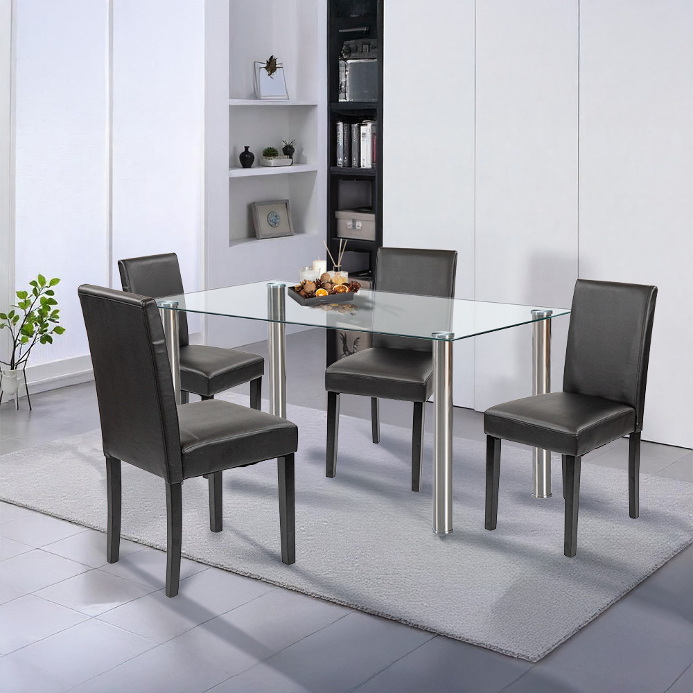 A szett négy darab Leziter Kelly széket is tartalmaz, amelyek fekete ECO bőr kárpitozással készültek. Az elegáns megjelenés mellett ezek a székek rendkívül könnyen tisztíthatók. A 4 cm vastag habszivacs ülőfelület hosszabb étkezések során is komfortot nyújt, a stabil fenyőfa lábak pedig 120 kg teherbírással garantálják a hosszú távú megbízhatóságot.