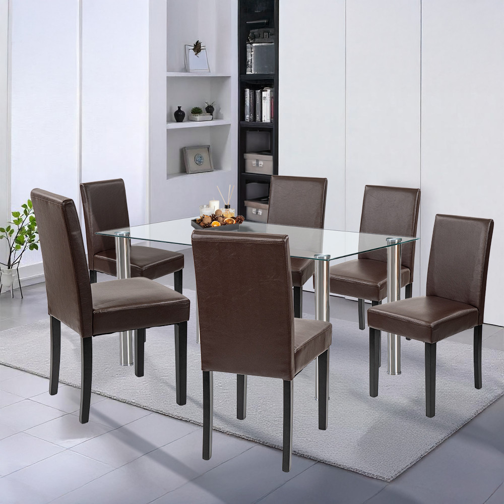 A szett hat darab Leziter Kelly széket is tartalmaz, amelyek barna ECO bőr kárpitozással készültek. Az elegáns megjelenés mellett ezek a székek rendkívül könnyen tisztíthatók. A 4 cm vastag habszivacs ülőfelület hosszabb étkezések során is komfortot nyújt, a stabil fenyőfa lábak pedig 120 kg teherbírással garantálják a hosszú távú megbízhatóságot.