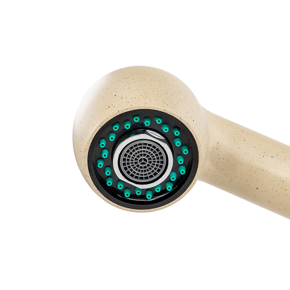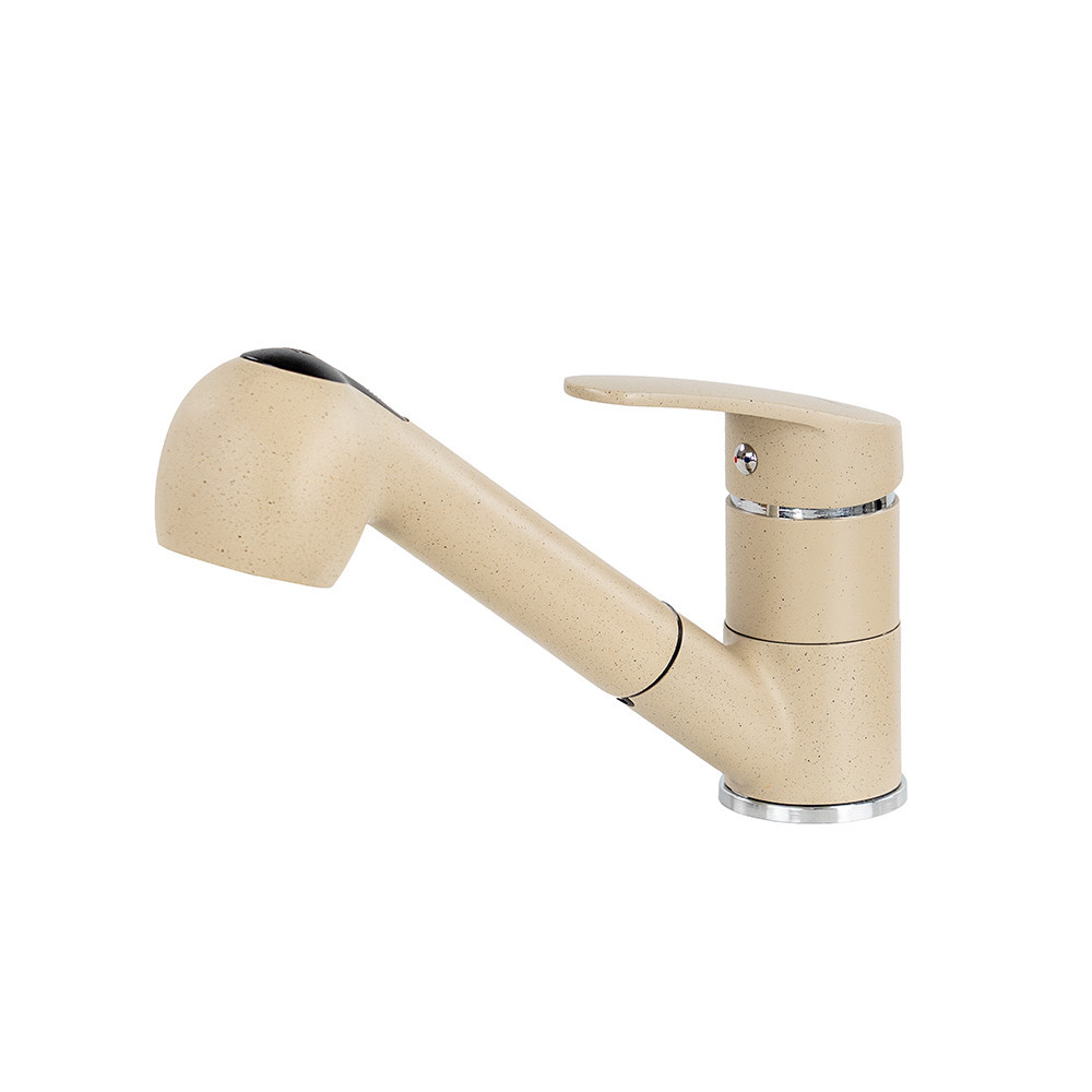 A Carol bézs színű konyhai kihúzható csaptelep a modern konyhák kedvence. Egyesíti a letisztult design eleganciáját a mindennapi funkcionalitással. Bézs árnyalata tökéletesen harmonizál a gránit hatású vagy világos mosogatótálcákkal, így egységes, igényes megjelenést biztosít a konyhapultodnak.