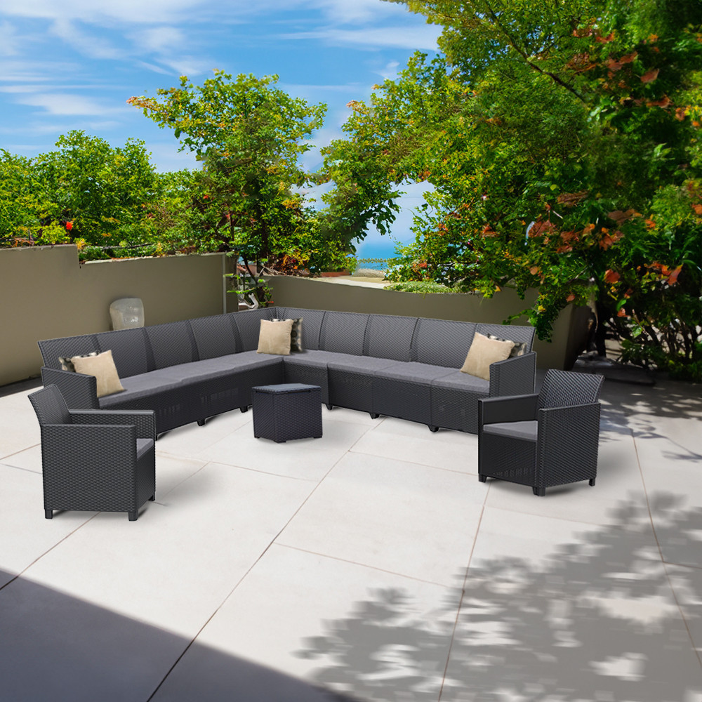 Ez a Grafit színű rattan hatású kerti bútor szett két fotellel, egy 11 személyes sarokkanapéval és egy tárolós asztallal rendelkezik, amelyeket időjárásálló műanyagból készítettek, így nem kell aggódnod a UV sugárzás hatásaitól sem. A fotel magassága: 74 cm, szélessége: 63 cm, hossza: 65 cm. A fotel és a kanapé párnával rendelkezik, mely kényelmessé teszi és színben passzol a bútorhoz. Az asztal magassága: 37 cm, szélessége: 37 cm, hossza: 37. Az asztal több funkciós, így a tároló részében elrejtheted a kerti eszközöket.