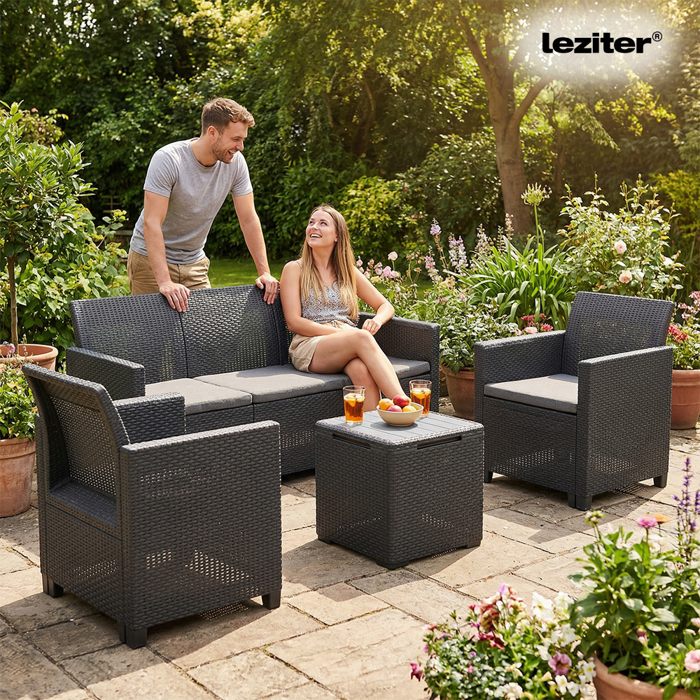 Ez a Grafit színű rattan hatású kerti bútor szett két fotellel, egy 3 személyes kanapéval és egy tárolós asztallal rendelkezik, amelyeket időjárásálló műanyagból készítettek, így nem kell aggódnod a UV sugárzás hatásaitól sem. A fotel magassága: 74 cm, szélessége: 63 cm, hossza: 65 cm. A fotel és a kanapé párnával rendelkezik, mely kényelmessé teszi és színben passzol a bútorhoz. Az asztal magassága: 37 cm, szélessége: 37 cm, hossza: 37. Az asztal több funkciós, így a tároló részében elrejtheted a kerti eszközöket.