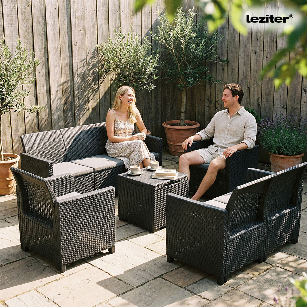 Ez a Grafit színű rattan hatású kerti bútor szett két fotellel, egy 3 személyes kanapéval, 2 személyes kanapéval és egy tárolós asztallal rendelkezik, amelyeket időjárásálló műanyagból készítettek, így nem kell aggódnod a UV sugárzás hatásaitól sem. A fotel magassága: 74 cm, szélessége: 63 cm, hossza: 65 cm. A fotel és a kanapé párnával rendelkezik, mely kényelmessé teszi és színben passzol a bútorhoz. Az asztal magassága: 37 cm, szélessége: 37 cm, hossza: 37. Az asztal több funkciós, így a tároló részében elrejtheted a kerti eszközöket.