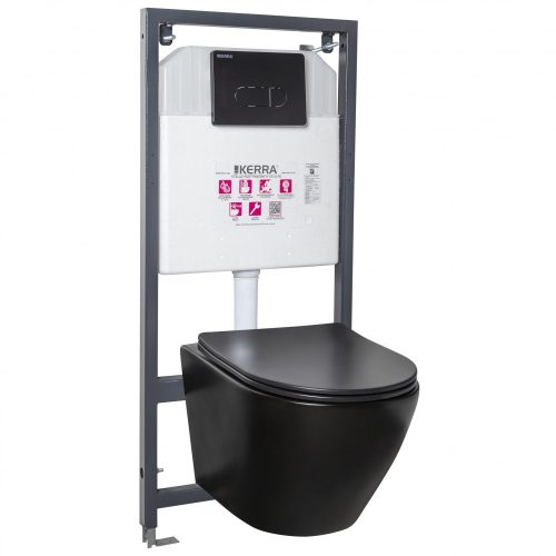 A készlet tartalma: 1 db rejtett rögzítőkeret tartállyal, 1 db Delos WC-csésze, 1 db wc ülőke (duroplast, soft-close), 1 db dupla nyomógomb (fekete)