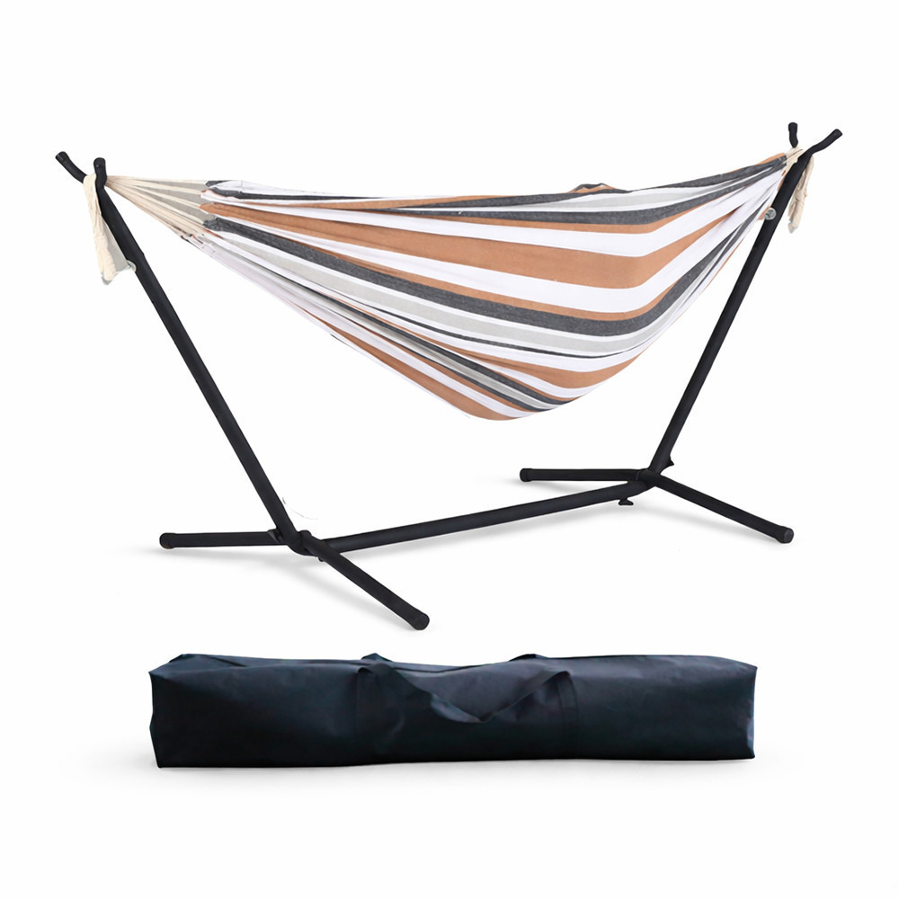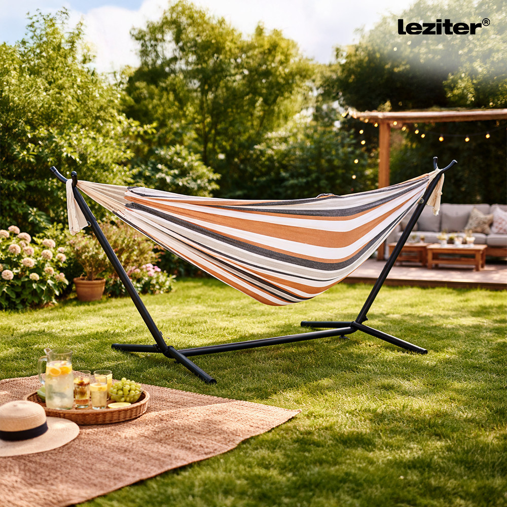 A függőágy csíkozott, bézs árnyalatú felület visszafogott megjelenést ad a függőágynak, amely könnyen illeszkedik különböző kerti és teraszos környezetekbe. A fekvőfelület kialakítása pihenéshez és lazításhoz használható.