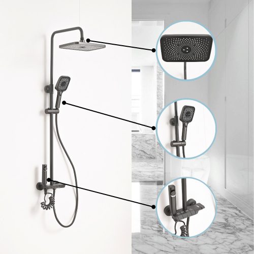 Az Eliz multifunkciós zuhanyszett a Leziter prémium kategóriájú modellje, amely a design, a funkcionalitás és a kényelem tökéletes egyensúlyát kínálja. A modern grafit árnyalat és a letisztult formák elegáns megjelenést kölcsönöznek bármilyen fürdőszobának, miközben a sokoldalú funkciók gondoskodnak a személyre szabott zuhanyélményről.
