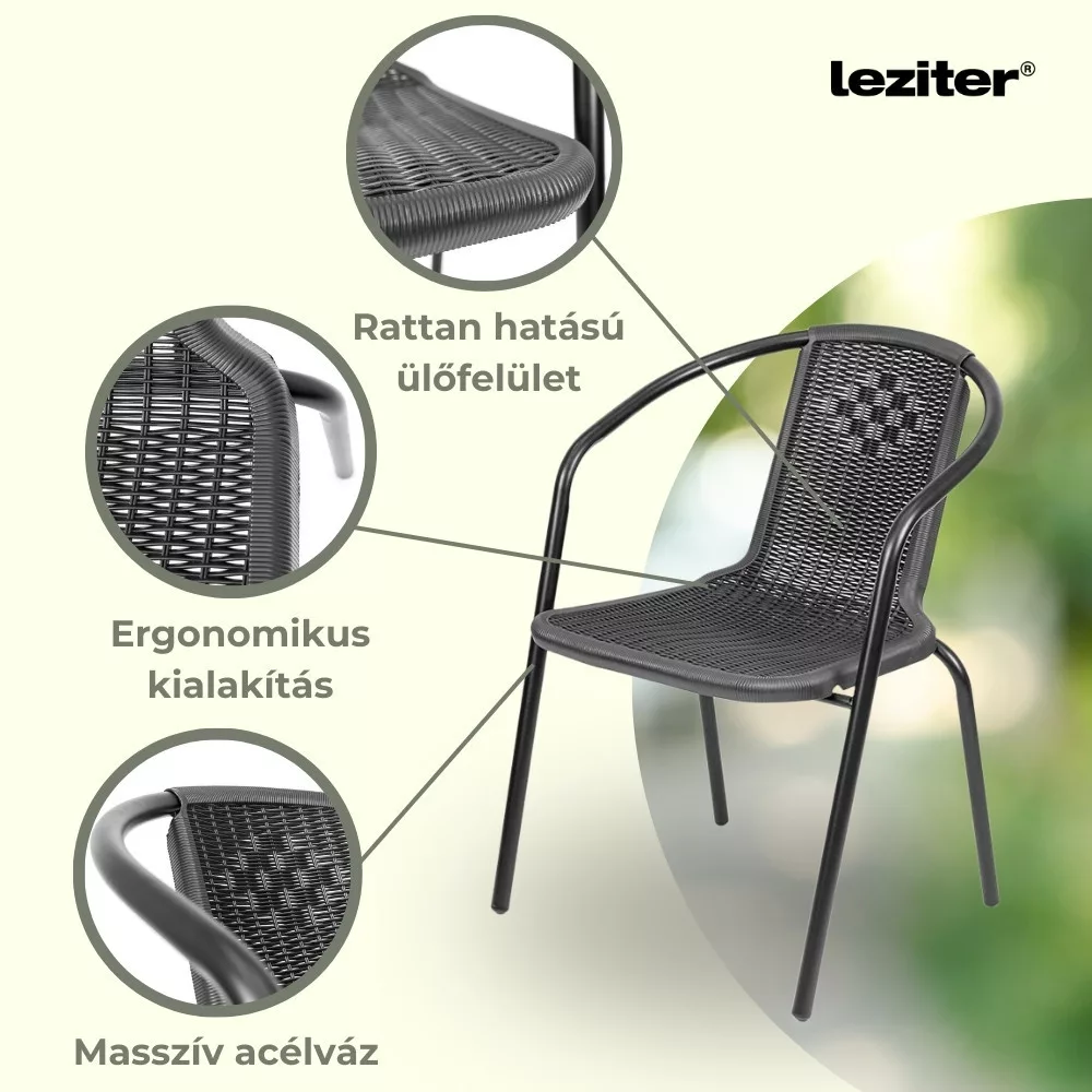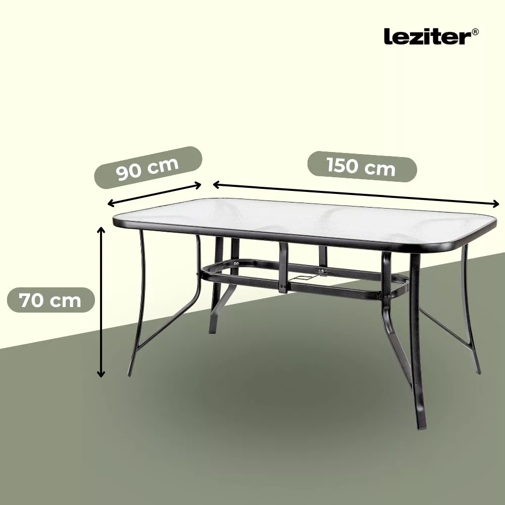 A modern kivitelű kerti bútorkészlet egy kerti üveglapos asztalt és 6 széket tartalmaz. A bútorokat 6 fő számára tervezték. A székek és az asztal lábazata fémből készül. Az asztallap 5 mm-es edzett üvegből készült, amely ellenáll a kisebb karcolásoknak. A műanyag szék ülésanyaga ellenáll az időjárási viszonyoknak. Előnye az ergonómikusan profilált ülés és karfa, amelyek tehermentesítik a vállakat pihenés közben.