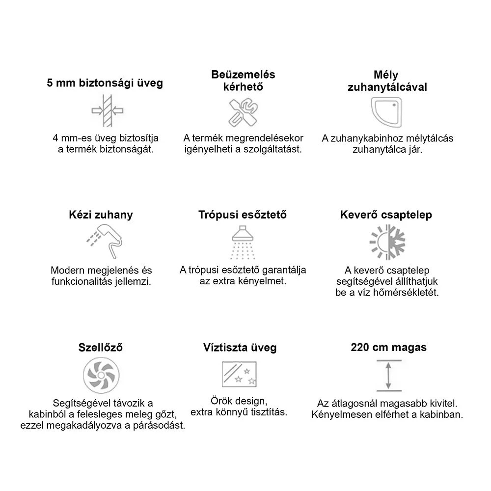 A kabint 5 mm vastag edzett biztonsági üveg veszi körül, amely sötétszürke fix üveg- és ajtópanelekkel, illetve fekete üvegfalakkal fokozza az esztétikai megjelenést. A matt króm vezetősínek és profilok tovább emelik a termék eleganciáját, míg a matt króm funkciópanel a vezérlési lehetőségek középpontjában áll. A kabin 6 hidromasszázs fúvókával rendelkezik, amely garantálja az egész testet átölelő masszázsélményt, miközben a beépített rádió, ventilátor, LED háttérvilágítás és felső világítás tovább fokozza a relaxáció élményét.