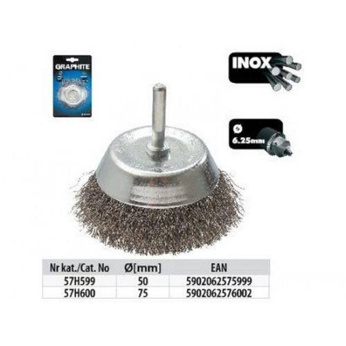 A GRAPHITE drótkefe 0,5 mm vastag rozsdamentes acél huzalból készül. A kefe megerősített kivitele lehetővé teszi a rozsdamentes és saválló acélból készült szerkezetek hatékony tisztítását. Rögzítése alkalmassá teszi használatát fúrógépekben.