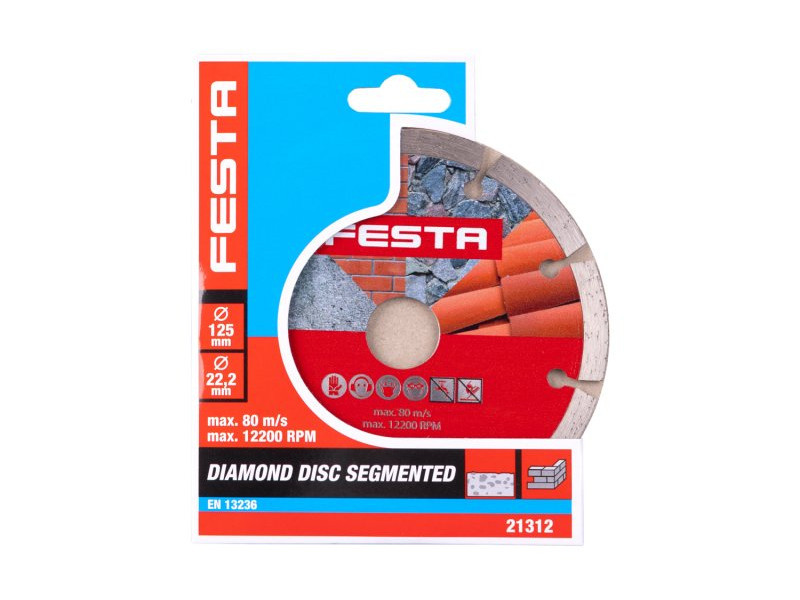 FESTA professzionális gyémántpenge, kialakítás: SZEGMENTES, kiváló minőségű anyagok és megmunkálás - a gyémánt szegmensek nagy szilárdságú rögzítése a penge tartótárcsájához, magas gyémántpor tartalom a szegmensekben, felhasználás: beton, tégla száraz vágásához , falazat, kő, ..., csomagolás: eurólyukkal ellátott buborékfólia, méretek: a termék megnevezésében szerepel.
