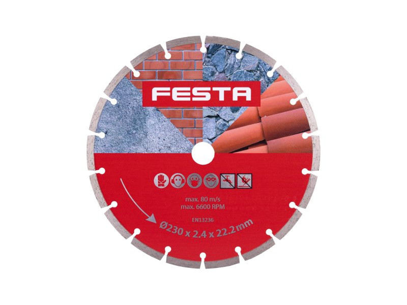 FESTA professzionális gyémántpenge, kialakítás: SZEGMENTES, kiváló minőségű anyagok és megmunkálás - a gyémánt szegmensek nagy szilárdságú rögzítése a penge tartótárcsájához, magas gyémántpor tartalom a szegmensekben, felhasználás: beton, tégla száraz vágásához , falazat, kő, ..., csomagolás: eurólyukkal ellátott buborékfólia, méretek: a termék megnevezésében szerepel.