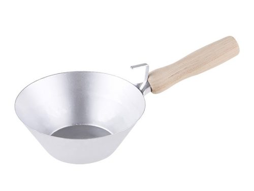 160 mm-es falazókanál fa nyéllel és akasztóval. Ez egy kőműves szerszám, amelyet építőanyagok mozgatására használnak: habarcs, beton stb.