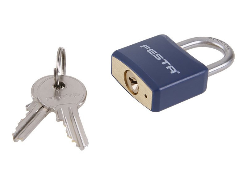 Lakat sárgaréz testtel és rozsdamentes acél ívvel. A zár sárgaréz teste műanyag bevonatú. 2 kulcs.