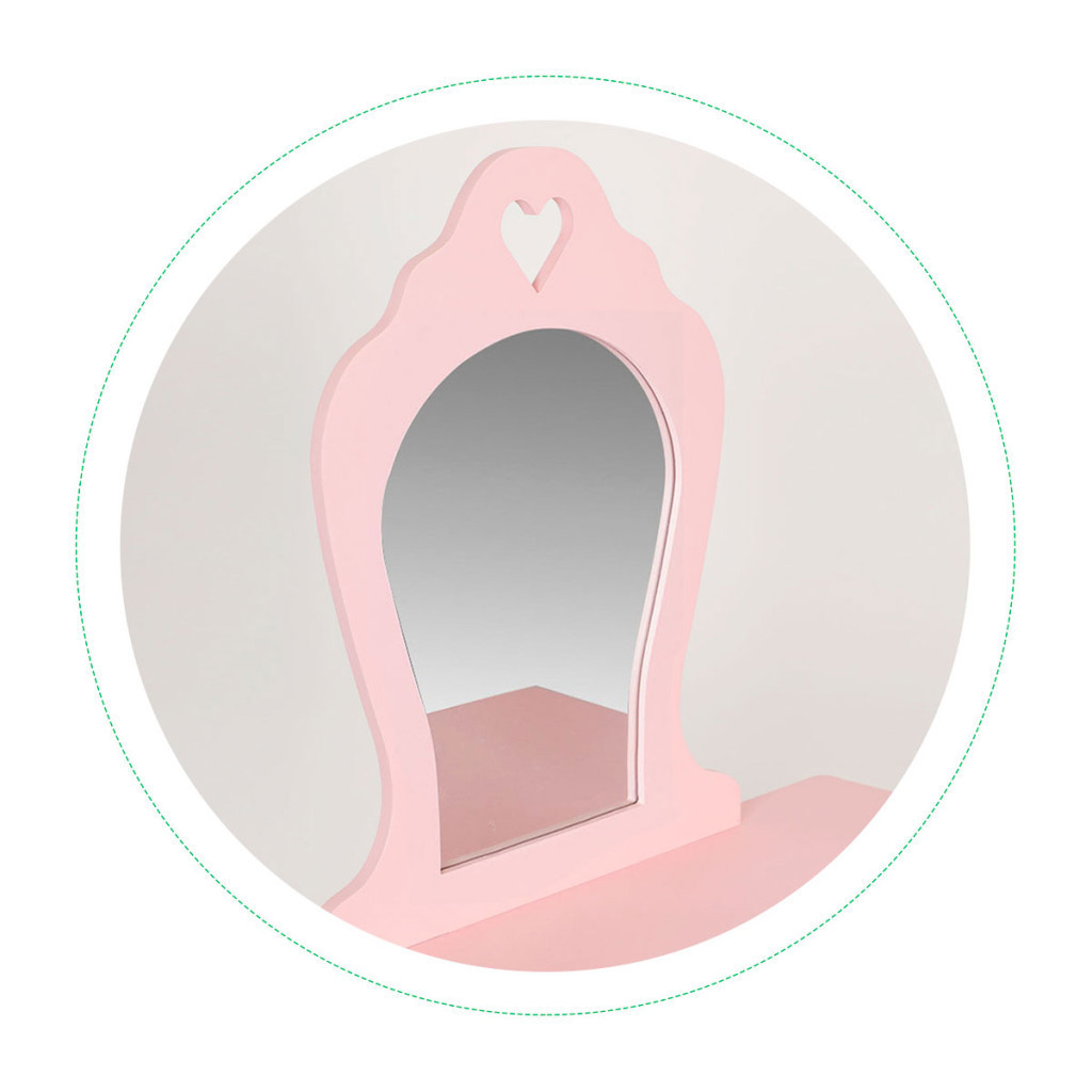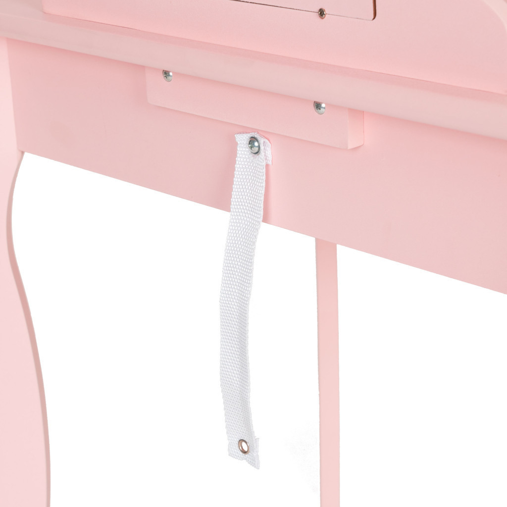Ennek a fésülködőasztalnak a fő jellemzője a nagy, dekoratív tükör, amely bájt kölcsönöz, és lehetővé teszi a kislányok számára, hogy láthassák ruháikat és élvezhessék a játékot. A tükör gyönyörű formájú, fokozza a fésülködőasztal eleganciáját, miközben megőrzi lányos hangulatát.