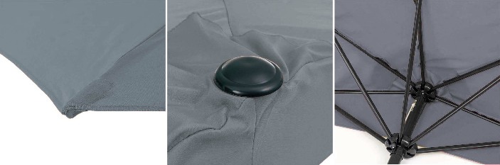 Maga az ernyő félkör alakú, kiváló minőségű 180 g/m2 poliészterből készül. Ezenkívül a felhasználó kényelme érdekében egy hajtókar-mechanizmust alkalmaztak, amely elősegíti a napernyő gyors kibontását és becsukását.