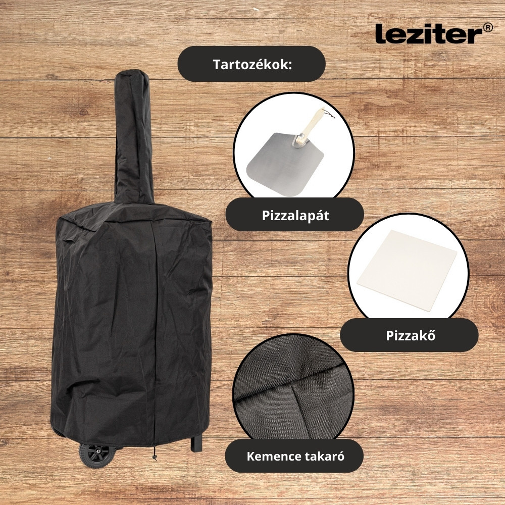 A kiváló minőségű, porszórt acéltest egyenletes hőeloszlást tesz lehetővé, míg a mellékelt pizzakő a tészta alját ropogósra süti. A lapát biztonságos és kényelmes kezelést nyújt, a sütőtakaró pedig megóvja a kemencét a szennyeződésektől, amikor épp nincs használatban.