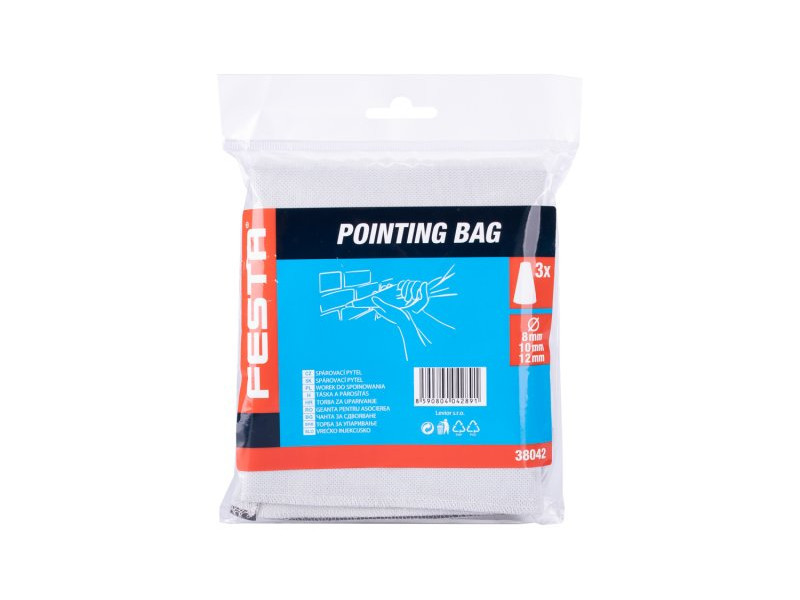 Fugazsák, speciális konstrukció, speciálisan ellenálló és mosható anyag, kiváló minőségű fuga - varratvarrat, amely a torta díszítőfóliájára emlékeztető formát alakítja ki, felhasználás: felbecsülhetetlen segítség a homlokzati falazat, tégla, mű- és természetes kő összeillesztésénél , tömbök és minden 10 mm-nél nagyobb szélességű hézag kitöltése, előnye különösen a fugamassza felhordása a kívánt helyre, a környező terület minimális szennyeződése mellett. Három cserélhető véggel, átmérő 8,10,12 mm.