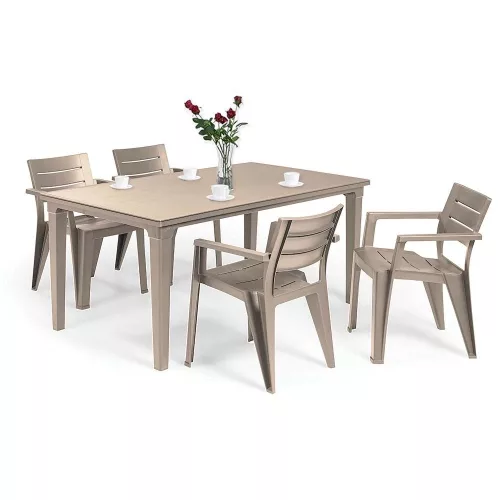 A Futura kerti asztal műanyagból, polipropilénből készül , ellenáll a kedvezőtlen időjárási viszonyoknak. Egész évben a szabadon állhat.Napfénynek kitéve nem halványul el és nem fakul. A Julie egy modern szék, amely a megfelelően profilozott háttámlájának köszönhetően rendkívül kényelmes. A bútor könnyű, szolid és ellenáll az időjárás viszontagságainak és az UV sugárzásnak. A székek egymásra helyezhetők, ami segít helyet megtakarítani és könnyebbé teszi a tárolását. A termék széles színválasztékban kapható.