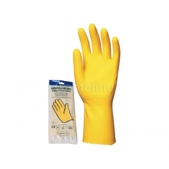 HTG SÁRGA GUMIKESZTYŰ, 30CM/0,5MM, PAMUTBOLYHOZOTT BELSŐ_M SÁRGA HÁZTARTÁSI GUMIKESZTYŰ: • sárga színű természetes latex • pamutbolyhozott belső • véd sav, lúg, hipó, háztartási vegyszerek és mikroorganizmusok ellen • 0,45 mm vastag, 30 cm hosszú • csúszás ellen érdesített tenyér • MÉRET: 8-as • CSOMAGOLÁS: 100/10 • EU szabvány: EN420, EN388: 1010, EN374-1, 374-2, 374-3: KL