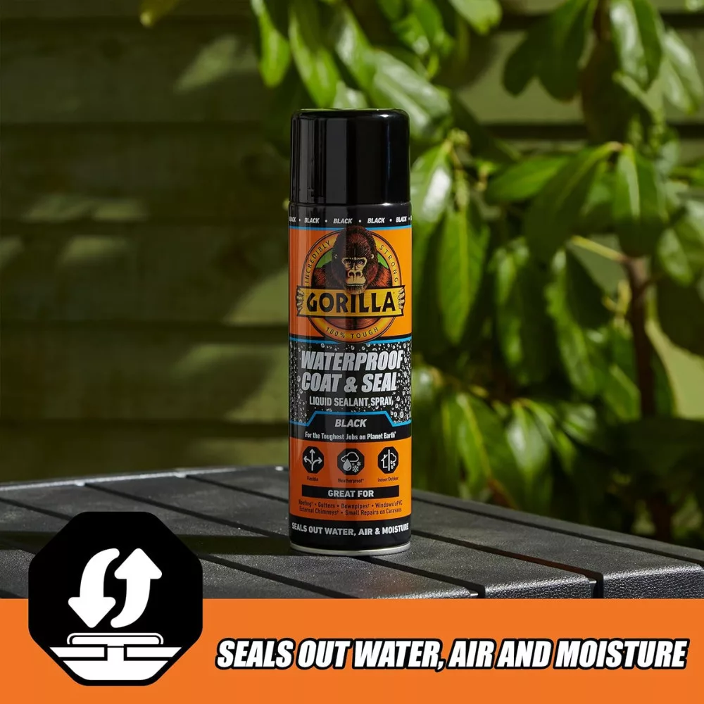 A Gorilla Waterproof Coat & Seal Spray egy rugalmas, időjárásálló bevonat, amely lezárja a vizet, a levegőt és a nedvességet. Kisebb szivárgások, repedések és kültéri-beltéri javítások gyors tömítésére készült. A spray egyszerűen, egyenletes rétegben felhordható, és tartós, vízzáró, matt felületet képez. Ideális tetőelemek, ereszcsatornák, lefolyók, ablakkeretek, PVC felületek, külső kémények és lakókocsik kisebb javításaihoz.