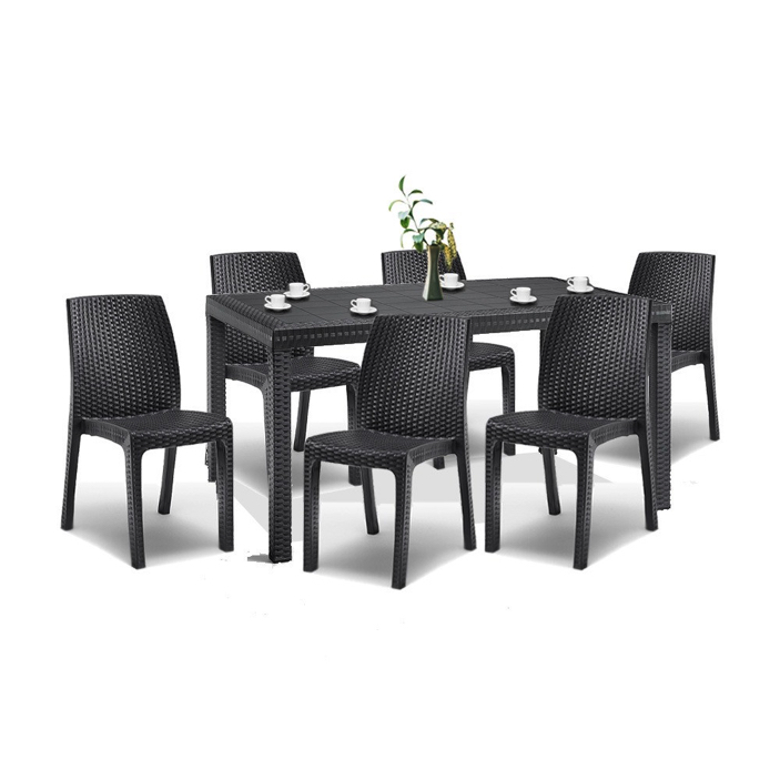 Ez a grafit színű, kényelmes és elegáns Hellda bútor szett négy 47x 59x 86 cm-es széket és egy 90x 150x 74 cm-es négyszögletes magas asztalt foglal magába. Ez az 4 személyes kerti bútor szett elegendő helyet biztosít az egész család számára, hogy a szabad levegőn tudjátok tölteni az időt. Nagyszerű választás,ha napközben szeretsz az udvaron pihenni és olvasgatni. Alkalmas családi összejövetelekhez. Ez a szett minden udvart és teraszt színesebbé tesz modern megjelenésével.