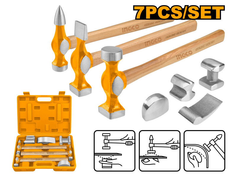 INGCO Karosszériás kalapács és egyengető készlet 7 részes Hickory nyéllel