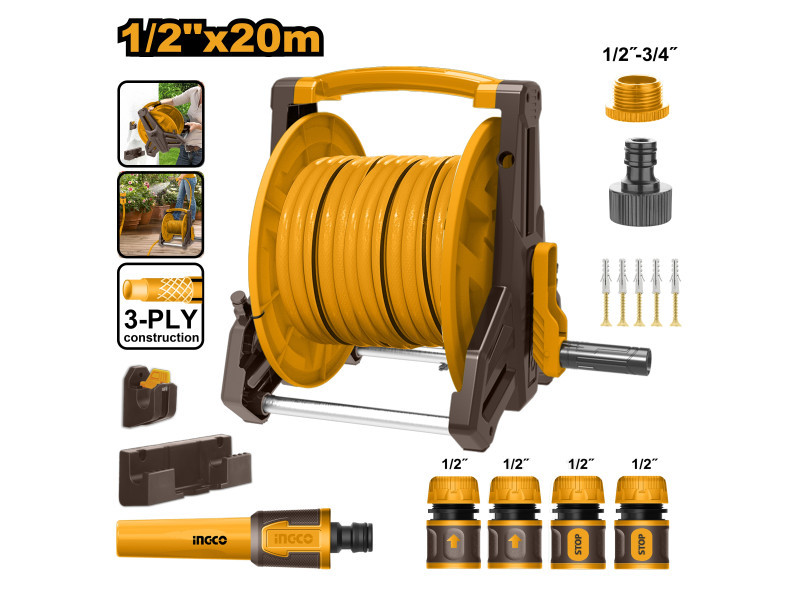 INGCO Tömlőtartó kocsi szett (1 x 20 m tömlő + 9 részes locsolástechnikai készlet)