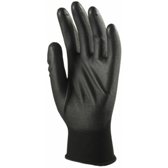 FEKETE PRECÍZIÓS KESZTYŰ, PU MÁRTOTT TENYÉRREL: • kötött, rugalmas, nagy szakítószilárdságú 100% poliészter szál • tenyéren poli